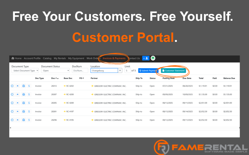 Fame’s Customer Portal gives your customers their own web portal to manage their rentals independently. They get 24/7 access to browse your fleet, create rental reservations, create sales orders, review and pay invoices, and more. This reduces your support calls and administrative work while giving customers instant access to what they need.